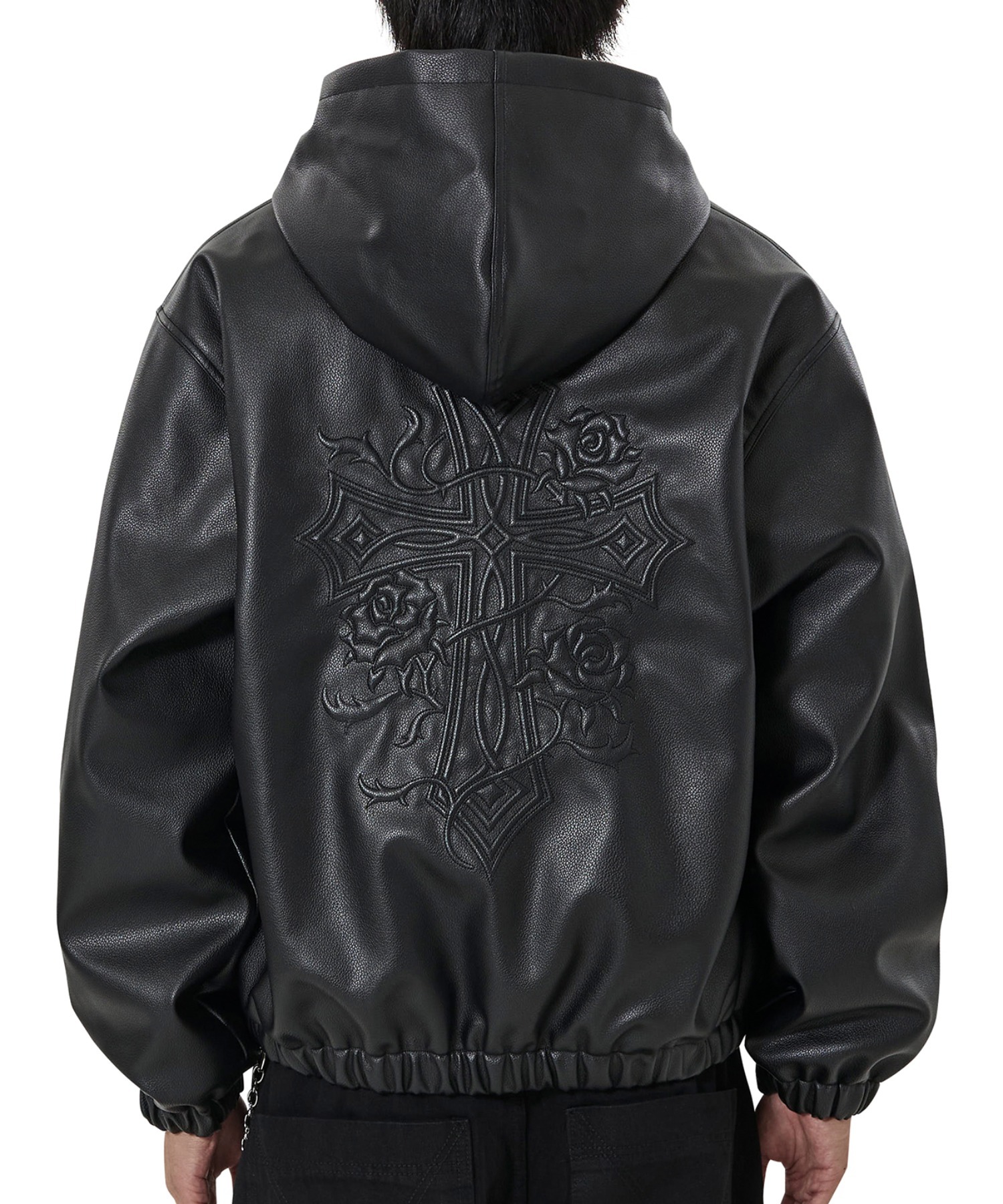 ジャケット・アウター deformation leather jacket oops clothing OY/オーワイ』EMBOSSED CROSS FAUX LEATHER HOODED JACKET/エンボス