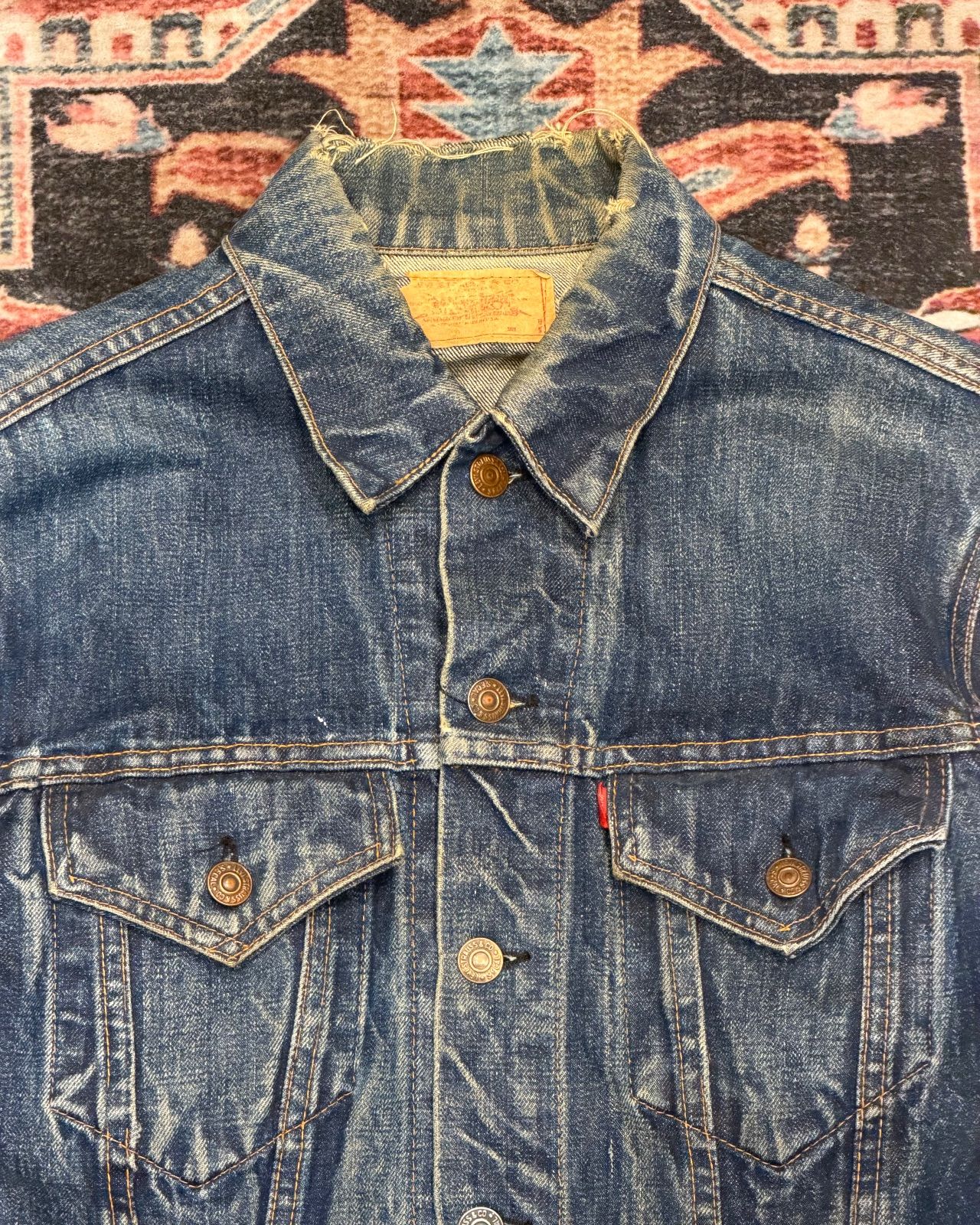 | 商品の特徴 | 4th BIG E / Levi's 70505 / 60s 70s USA 】 リーバイス デニム。60's Levi's 70505 BIG-E デニムジャケット 濃青 実寸(44位) | SOLD。リーバイス 70505 ビッグE【Levis - 70505 BigE】【Late 1960's。★値下交渉不可★リーバイス のデニムジャケットになります。ハチノス、ヒゲが見事に出ています。デニムジャケットはパンツと比べると着用機会が少なく、また、タイトではないため、ここまで育てるのはかなりの年月と忍耐が必要になります。ダメージ加工された紛い物とは貫禄が違います。色々な部分が補修されております。生地も劣化しているため、その都度リペアが必要になります。これもまた楽しみの一つとしてお考えください。とにかく格好良く、これ一着でスタイルがキマります。古着、ビンテージにご理解のない方はご遠慮ください。かなり前に古着で購入したため製造年や詳しい事は分かりかねます。70505 BIG-Eサイズ : 36現在はタグが欠損しておりますが、36で間違いございません。実寸(素人採寸)肩幅:45、身幅:48、袖丈:59、着丈:57すり替え防止の為、いかなる理由においてもキャンセルはお受けしません。ご不明な点は事前にご質問ください。。60's Levi's 70505 BIG-E デニムジャケット 良雰囲気 表記(48) ビッグ。ジャケット・アウター Supreme Gore-Tex Taped Seam Shell Jacket。NUMBER (N)INE 01SS TIME期 ナイロンジャケット スカル。グッチ GUCCI ナイロンジャケット。sf アークテリクス スコーミッシュフーディ パッカブル。MONCLER ネイビー ナイロンジャケット モンクレ モンクレール サイズ2。ジャケット・アウター AURALEE LIGHT NYLON HALF ZIP P/O size5。Adidas Fucking Awesome トラックジャケット。ジャケット・アウター AIR JORDAN off-white track jacket。patagonia シェルドシンチラ ブラック。90s USA製 bitch skateboards コーチジャケット。adidas WALES BONNER トラックジャケット。supreme trekking convertible jacket Lサイズ | ||