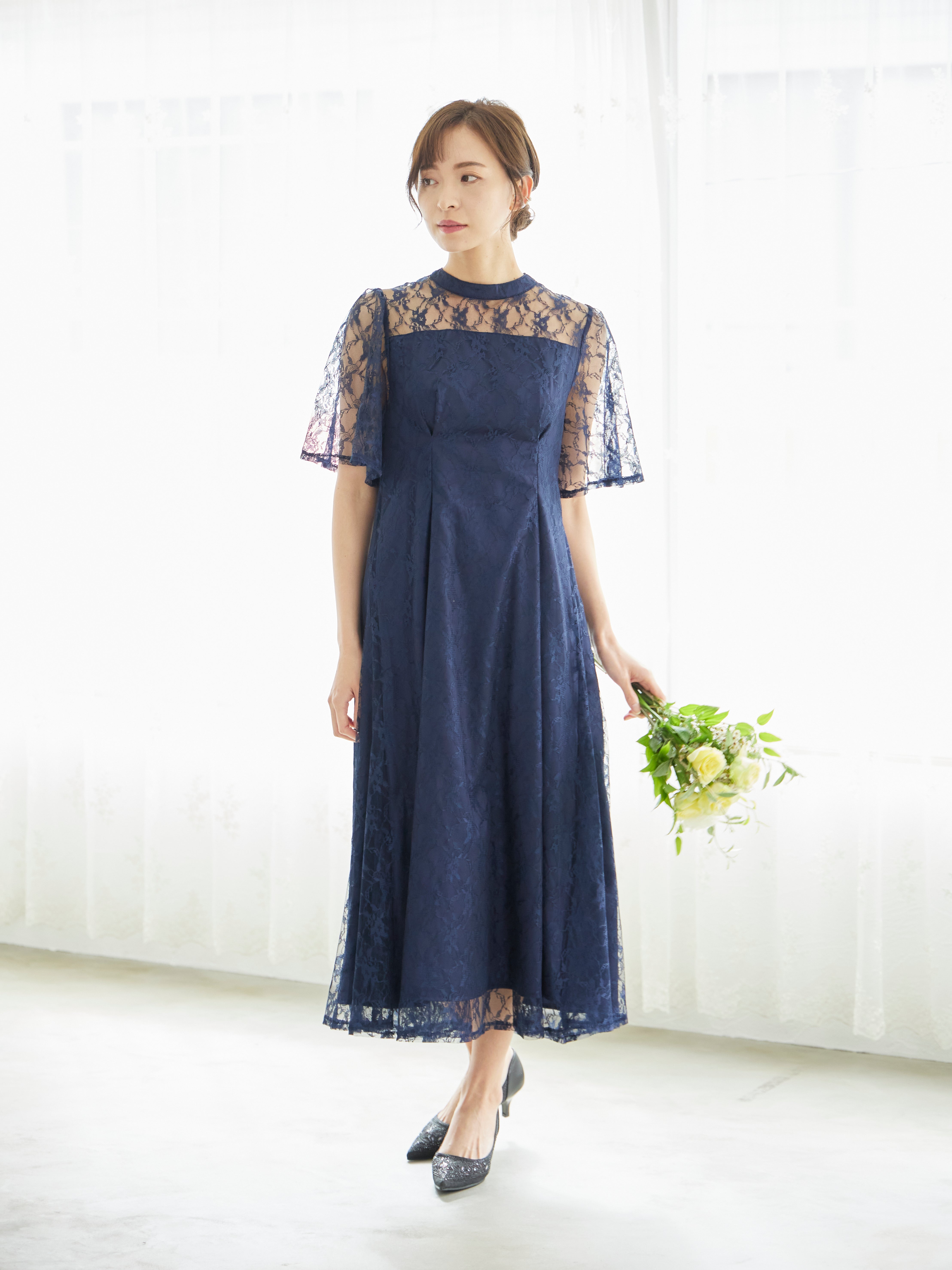 - レディース > スーツ・フォーマル・ドレス > ネイビーブルー ハイネックドレス ビーズ装飾 レンタル] BELINDA DE CAPRIS 総レースフレア袖 ハイネック ワンピース