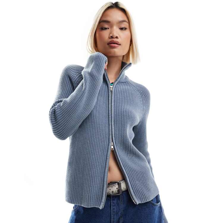 【サイズ2】High Density Cotton Knit Cardigan Monki ribbed knit two way zip cardigan in blue acid wash | ASOS