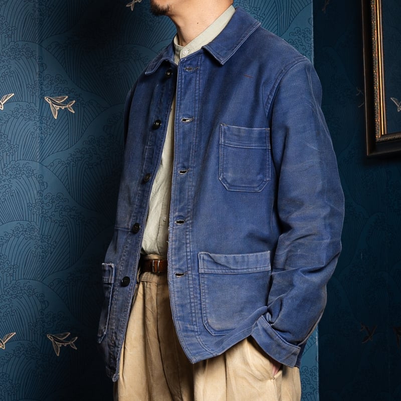 - メンズ > ジャケット・アウター > 40s モールスキンジャケット パッチワーク ユーロワークジャケット 40s France Vintage Blue Moleskin Work Jacket |